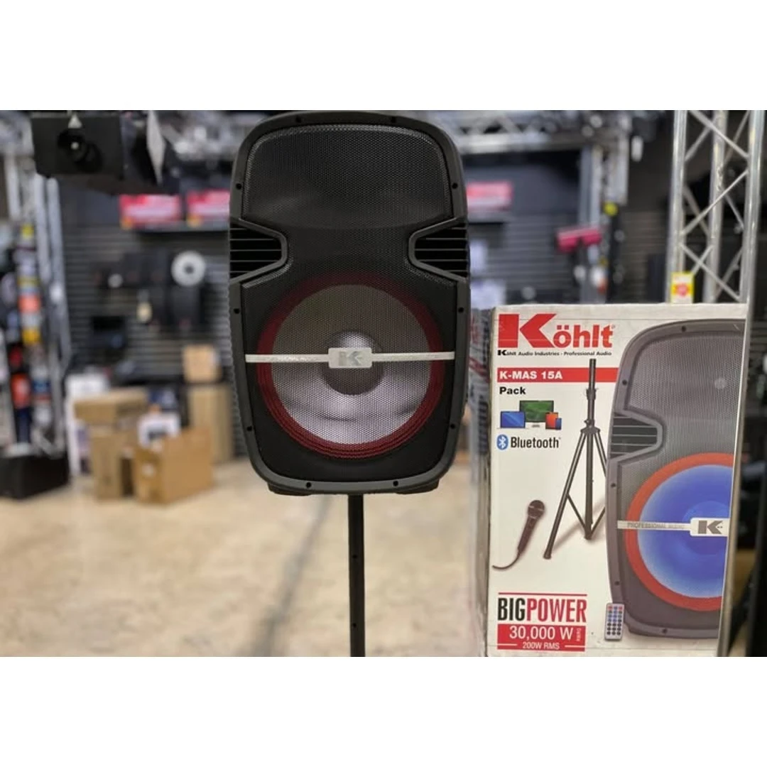 Altavoz activo con Bluetooth. Incluye micrófono, soporte, control remoto y Bluetooth.